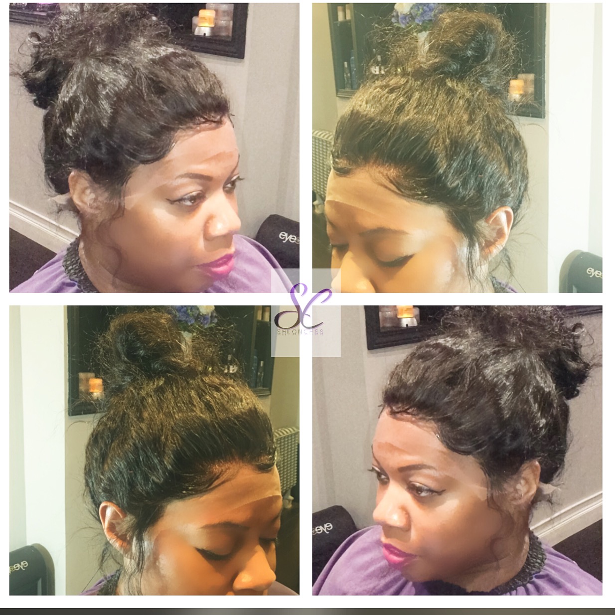 I bet you are wondering..."What will they think off next?" This 360 frontal band is amazing! Go ahead, braid all of your natural hair up and let this unit give the glory! So, in the photo, I only applied the 360 frontal unit to show you all the mechanics of it. As you can see, I didn't cut the lace because she wanted a different style however, she kindly agreed to let me take a few pics of her wearing it. As you can see in the picture on the right, there is an opening in the center which allows your stylist to sew bundles of hair to fill it in. I didn't fill it in, I only pulled it up into a bun to show how full and beautiful this lace system is. Just imagine if I had sewn bundles in the center!? Can you picture how full this will look...its already a nice sized bun without the added bundles! Well, this 360 frontal is 16"s long at stretched length. The longest I sell these in is 22"...I only do pre orders because it has to made so it will take approximately 6 business days to arrive at your door! want one?? click here I got you covered!